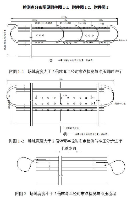 根據實測輪迹可(kě)知(zhī),壓實輪每轉♥∑動一(yī)圈前進6.3M,産生(shēσ€®ng)3個(gè)0.7m+0.8m的(de)矩形輪迹εδ,雙輪外(wài)援總寬2.7m。壓實地(dì)一(yī)遍時(s→σhí),前後輪痕迹中心點縱向排距L=3aγ☆ =2.1m。壓第二遍時(shí),右輪痕迹插入第一(yī)遍輪迹之間(<jiān),形成縱向排距L=1.25a=0.875m。以此類推,路(lù)基頂↕≤'€面壓實12m,理(lǐ)論上(shàng)壓實機(jī)械需行(x€→ ★íng)駛約3.5圈方可(kě)全斷面壓實一(yī)遍,實際試驗時(shí✔ ↕),安排沖擊壓路(lù)機(jī)行(xíng)駛5圈為(wèi)一(yī)®δ• 遍。在沖擊壓實前原始狀态下(xià),先對(duì)路(lù)基各項♠÷₹基本物(wù)理(lǐ)指标檢測一(yī)次。以後每壓實₩β≥δ8遍分(fēn)别進行(xíng)一(yī)次檢測,每個(gè)↑←φ試驗段共壓實30遍,檢測6次,從(cóng€₽±☆)而可(kě)以看(kàn)出結果。