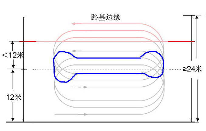 通(tōng)過沖擊式壓路(lù)機(jī)“回形針環跑&rdσ¥quo;路(lù)線一(yī)文(wénΩπ•)中我們了(le)解到(dào),當路(lù)基寬度大(dà₽β)于等于24米時(shí),可(kě)采ε∏γ取“回形針環跑”路(lù)線(見(jiàn)下(↓≈₹✘xià)圖左),但(dàn)是(shì),當路(lù)基寬度小(xiǎo)于2✘₩↓→4米時(shí),沖擊式壓路(lù)機(jī)靠近(jìn)中心位置時(shí),就(jiù)會(hu★&ì)出現(xiàn)調頭位置不(bù)夠的(de)情況(見(jiàn)下(xiε☆±↑à)圖右紅(hóng)色标記處):
